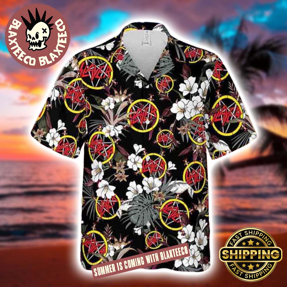 Slayer Logo With White Hibiscus Tropical Pattern Summer 2025 Hawaiian Shirt