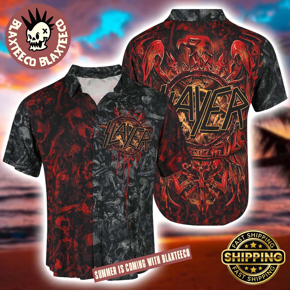 Slayer Multicolour Skull Pattern Blood Eagles Red And Grey 2025 Summer Hawaiian Shirt
